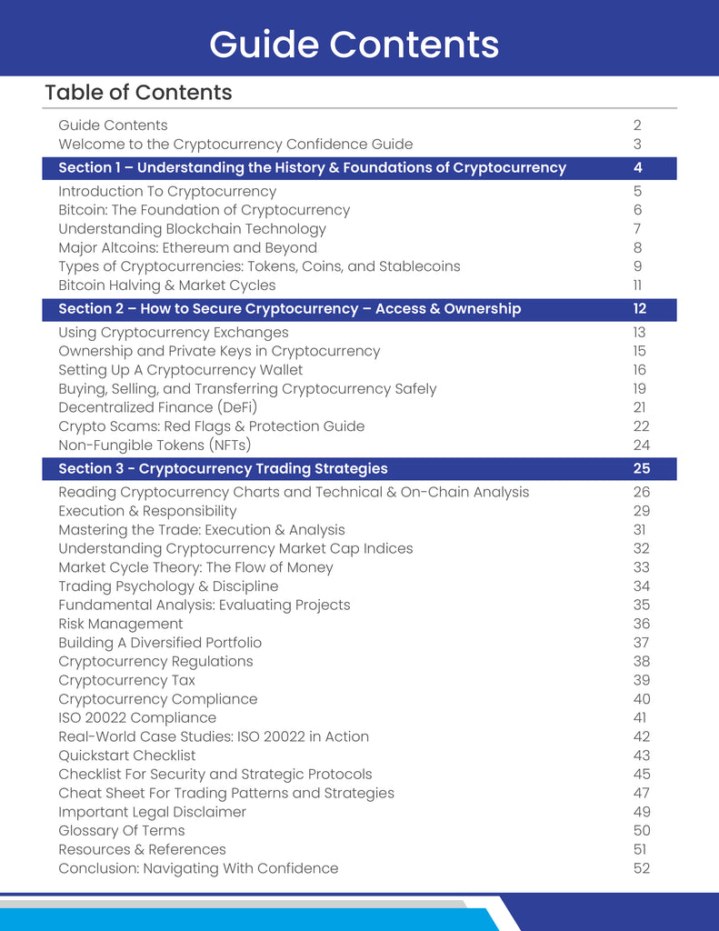 It covers key topics including Bitcoin, major altcoins, cryptocurrency security, wallets, exchanges, market cycles, tax and regulation, trading fundamentals and much more. The guide also explains important concepts such as blockchain technology, decentralized finance (DeFi), and common cryptocurrency scams so readers can navigate the space with greater awareness and confidence.